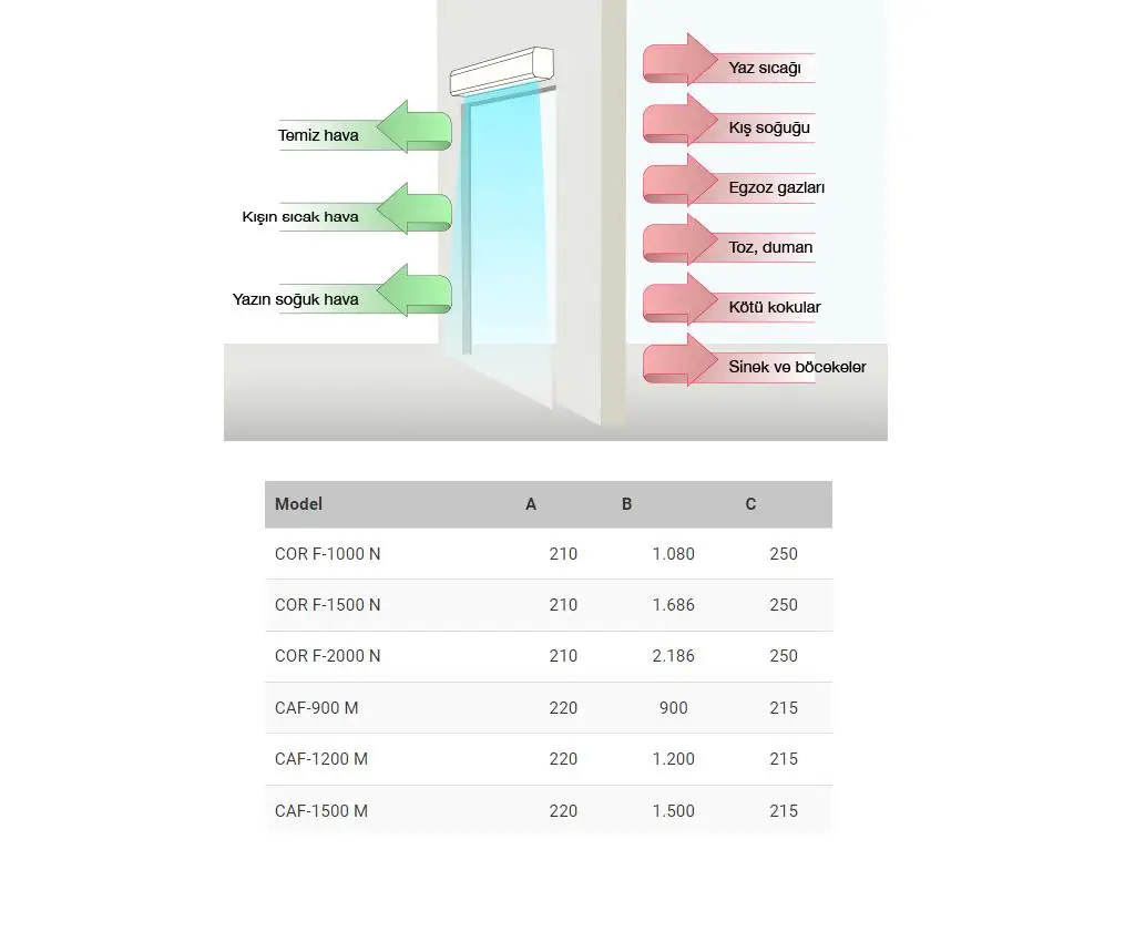 | Ortam Havalı Modeller | COR F-1000 N | COR F-1500 N | COR F-2000 N | CAF-900 M | CAF-1200 M | CAF-1500 M |